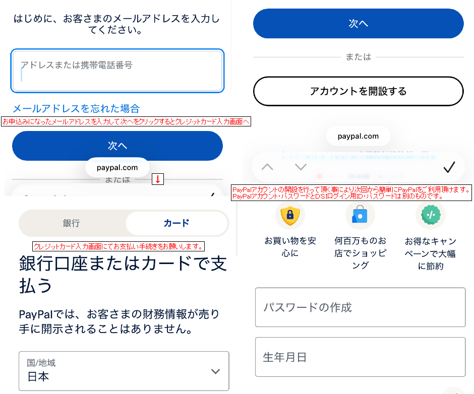 ・PayPalアカウント・パスワードとDSIログイン用ID・パスワードは関係ありませんのでご注意下さい。